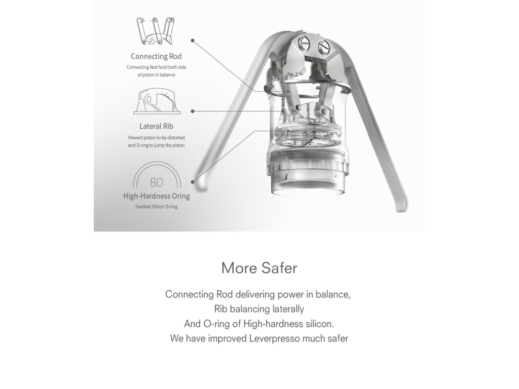 Kávovar Leverpresso je vyrobený z odolného plastu, ktorý neobsahuje žiadne BPA, hliník ani nerezovú oceľ. Kávovar spĺňa medzinárodné bezpečnostné normy.